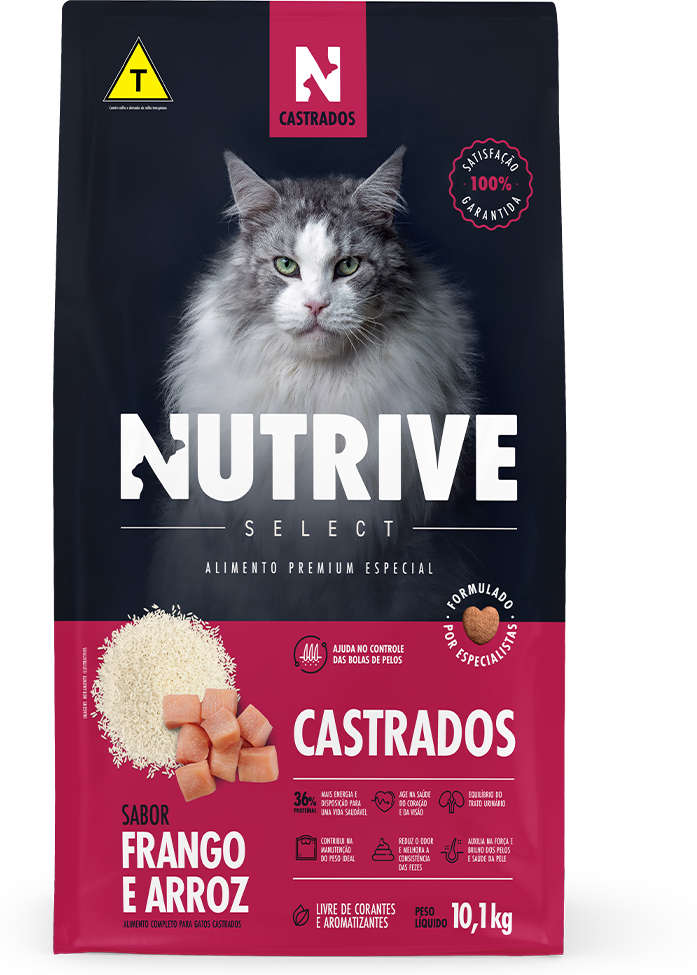 A Ração Seca Nutrive Select Frango e Arroz para Gatos Castrados é um alimento completo e balanceado, desenvolvido especialmente para atender às necessidades nutricionais do seu pet. Contribui para a manutenção do peso ideal, graças à presença de L-Carnitina, que auxilia no processo de queima de gordura. Promove redução do odor e melhora a consistência das fezes, graças à combinação do extrato de yucca com zeólita. Favorece a força e brilho dos pelos e a saúde da pele, devido à presença de ômegas 3 e 6 e zinco. Conta ainda com minerais orgânicos, oferecendo uma opção de qualidade para a dieta dos gatos castrados.